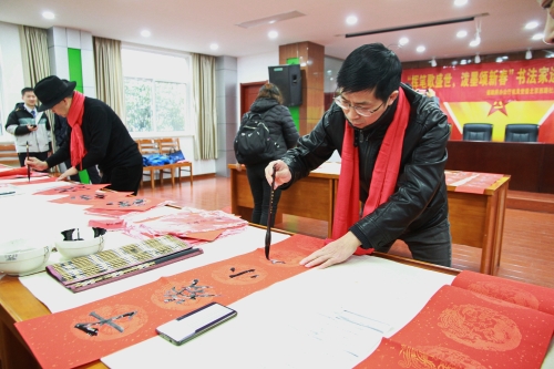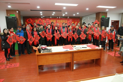 1月8日下午,由区政协常委殷绍泽牵头,区政协教卫文体(文史)委和政协湖南路街道工委主办的书画名家“写春联、送福字”进军营活动在丁家桥社区举行。多名老将军、书画名家的参与,为活动增添了不少亮点。1月9日下午,由区政协常委殷绍泽牵头,区政协教卫文体(文史)委、政协挹江门街道工委主办的书画名家“写春联、送福字”进军营活动在钟阜路社区举办。书画家们现场挥毫泼墨,为大家书写春联,送出新年祝福。 1月9日下午,由区政协常委翟优牵头,政协教卫文体(文史)委及其他单位共同承办的“迎春送福—江苏书画名家送福走进南京市鼓楼区凤凰街道社区活动”在凤凰街道党群服务中心举行。区政协副主席周越古参加活动并致辞。1月12日上午,祝峻委员工作室与下关街道联合举办南京城墙“城门挂春联”进社区暨阅江楼宜居街区“阅享家·新春全家福”活动,与街道社区居民共迎新春。1月14日下午,区政协常委石延平、陆大有牵头,鼓楼区政协与宝塔桥街道共同主办的“政协委员送福送温暖”活动在南京鼓楼区宝塔桥街道金陵二村党群服务中心举行,九名书画家参加了“写春联、送福字”活动。书法家们笔走龙蛇,各显身手,将真诚的祝福付诸笔端,一副副墨香四溢的春联和福字让现场的气氛更加热烈。 1月16日上午,区政协经科委组织部分党员到宁海路街道北京西路社区参加多家单位联合举办的“挥笔歌盛世,泼墨颂盛世”书法家进社区活动。徐仲芳同志挥毫泼墨,书写春联赠送给部队老首长、部队官兵和社区居民,与大家一起共庆新年。